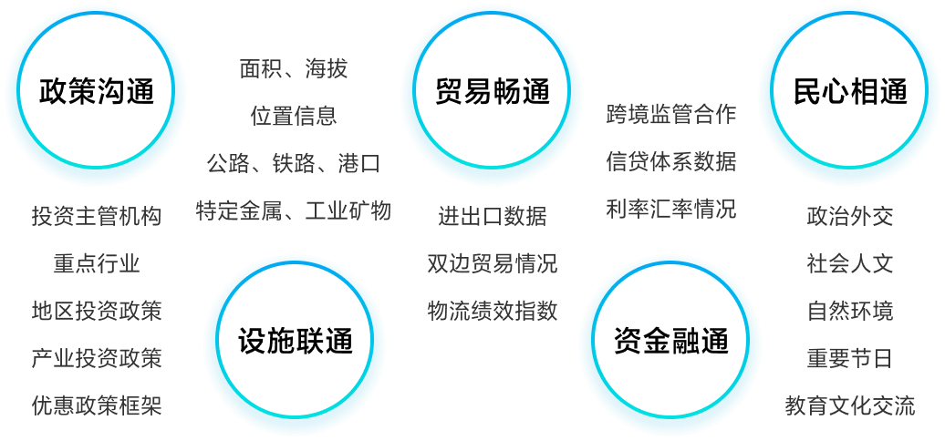 五通數據綜合“一帶一路”共建國家和地區在政策溝通、設施聯通、貿易暢通、資金融通、民心相通這五項發展水平指標情況,反映共建國家和地區互聯互通水平,為推動高質量“一帶一路”建設提供參考依據。